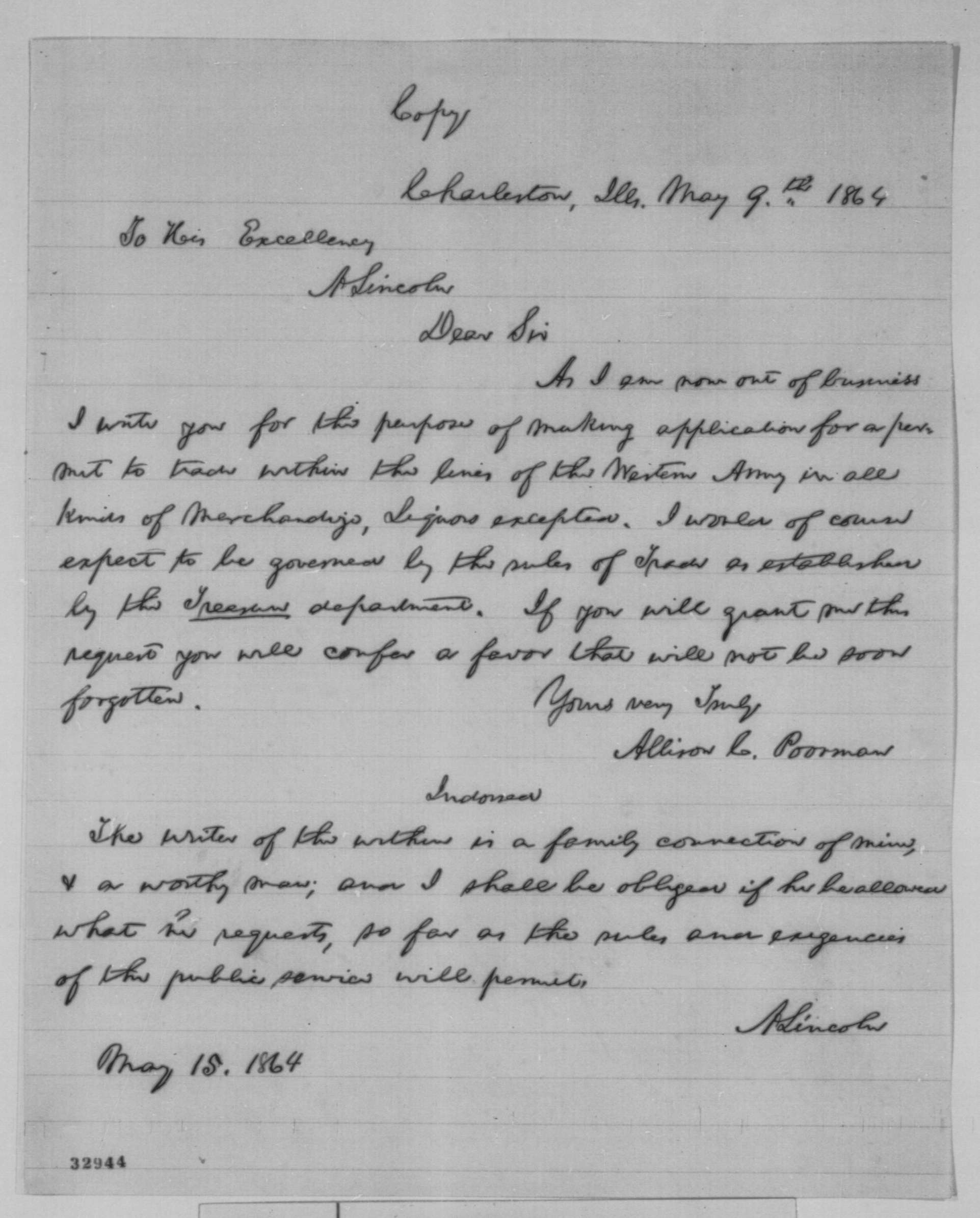 Nicolay to Bates, 15 May 1864, John G. Nicolay Papers, Library of Congress, Washington, DC. Lincoln endorses request of Allison C. Poorman, of Illinois, for permit to trade within